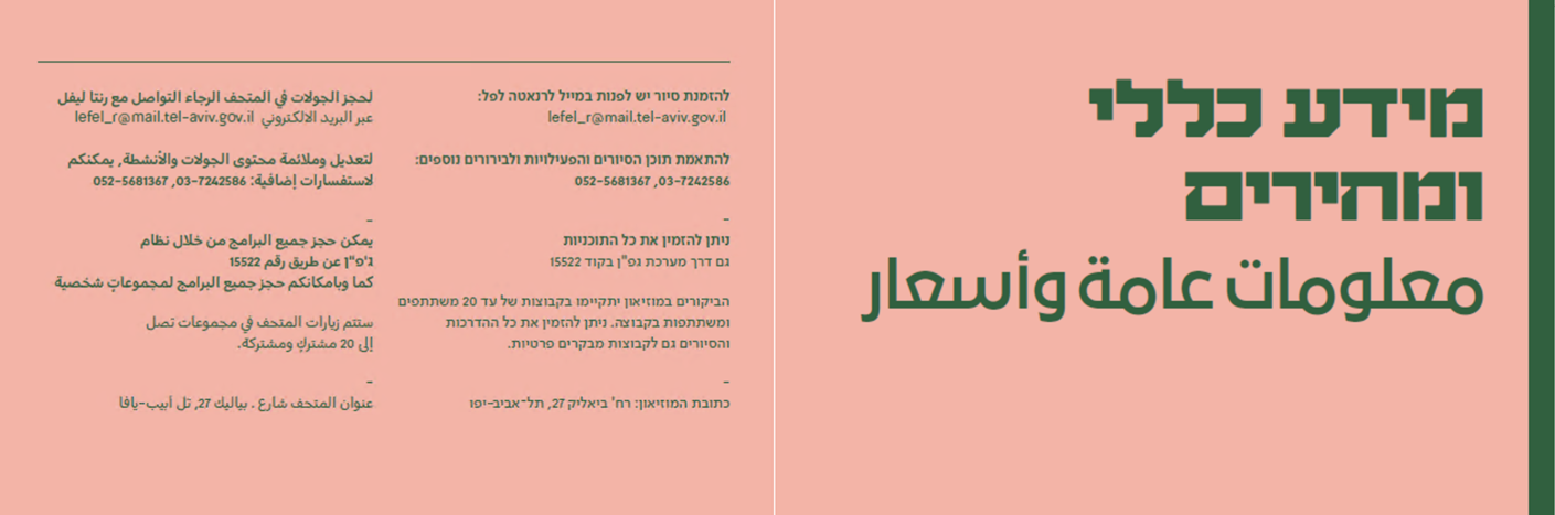 * להזמנת ביקור יש לשלוח מייל לרנאטה לפל: lefel_r@mail.tel-aviv.gov.il