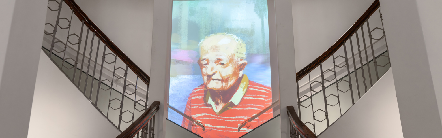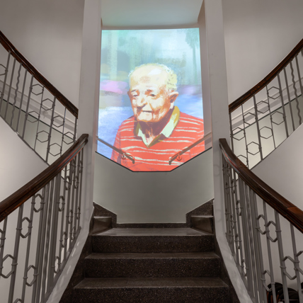 The animation work “Sympathy” is projected onto the historic staircase of the Tel Aviv-Yafo City Museum, where the building meets the street. Created specifically for this spot, it serves as a “gateway” between the museum’s interior and exterior and between the building’s past and present. The projection presents elaborate illustrations of the city’s residents, one after the other. Some of them look directly at us, while others look away. Each figure is fully present for a few moments before it fades away, as if swallowed back into the city.