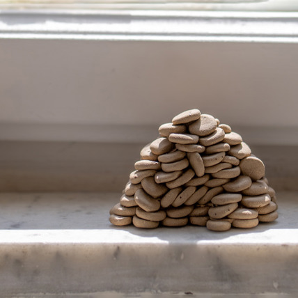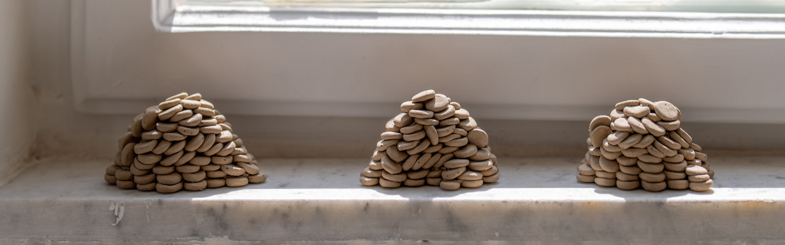The second work, “Mrs. Jacobovitz”, consists of a stair railing combined with a eucalyptus branch and the rubber tip of a walking cane. Efrati uses these elements to conjure a specific figure: a typical, almost stereotypical neighbor who goes up and down the stairs every day at the same time. Another element in the work, clay “cat food,” suggests that she is returning home after the daily ritual of feeding street cats.